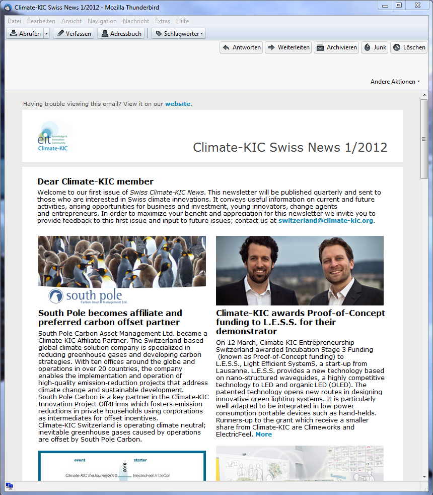 - Die Inhalte der Newsletter können aus dem regulären TYPO3-Inhalten zusammengestellt werden. Speziell bei Climate-KIC ist die Ausgabe in 2 Spalten.