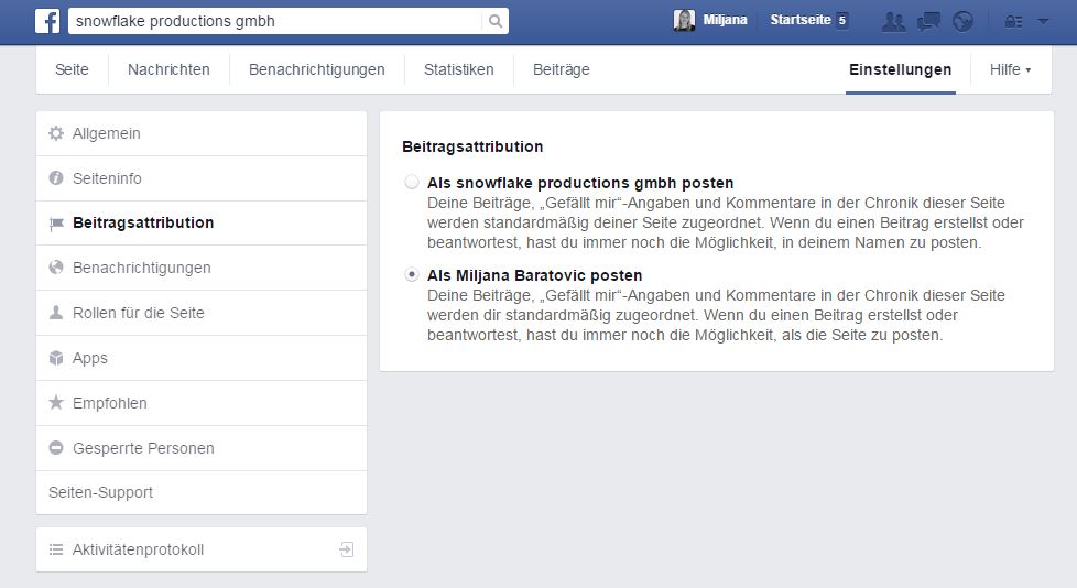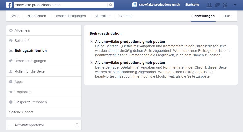 Grundsätzlich gilt: Wechselt man oben rechts den Nutzer auf die Unternehmensseite, dann liked, kommentiert und postet man immer im Namen der Unternehmensseite. Deshalb kann man die Einstellung, wenn man Facebook als snowflake benutzt, auch nicht bearbeiten: