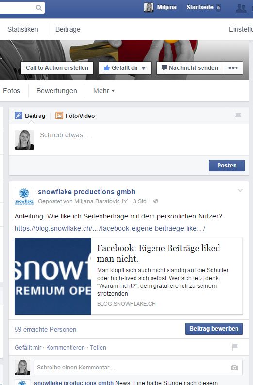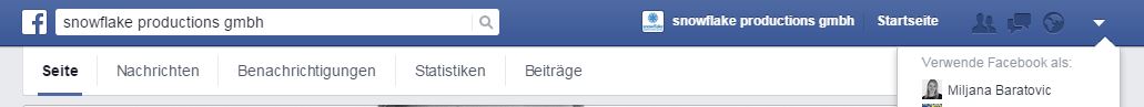 Hier kann man dann auswählen, ob man jeweils mit snowflake oder mit dem persönlichen Account posten will. Achtet darauf, dass ihr Facebook immer noch mit dem persönlichen Nutzer verwendet. Ansonsten wird euch die Seite gemäss dem ersten Screen angezeigt. Ob es richtig umgestellt wurde sieht man dann jeweils daran, ob das eigene Bild erscheint beim Beitrag erfassen.