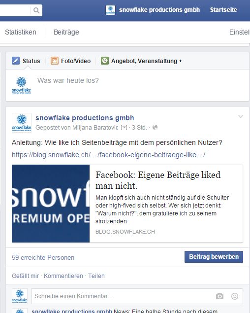 So nun kann man den neusten Unternehmensbeitrag liken, ohne dass es so aussieht, als ob die Seite ihre eigenen Beiträge liked.