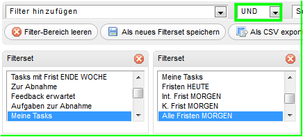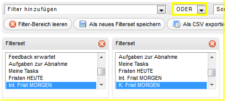 Jetzt gibt es aber auch Filter, die bei diesen beiden Datumsfeldern nicht nur ein bis, sondern auch ein ab Wert berücksichtigen müssen: Tasks mit Frist MORGEN z.B. soll ab Morgen (0:00) UND bis Morgen (24:00) prüfen, ohne Heute. Aber die beiden Datumsfelder Interne Frist und Kunden-Frist sollen wiederum mittels ODER verknüpft werden, und das ist in einem Filterset nicht möglich. Es gilt UND oder ODER.