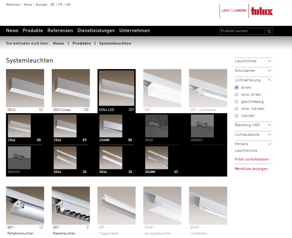 Es kann nach Produkten gesucht oder Produkte können nach dieversen Filterkriterien zusammengestellt werden.