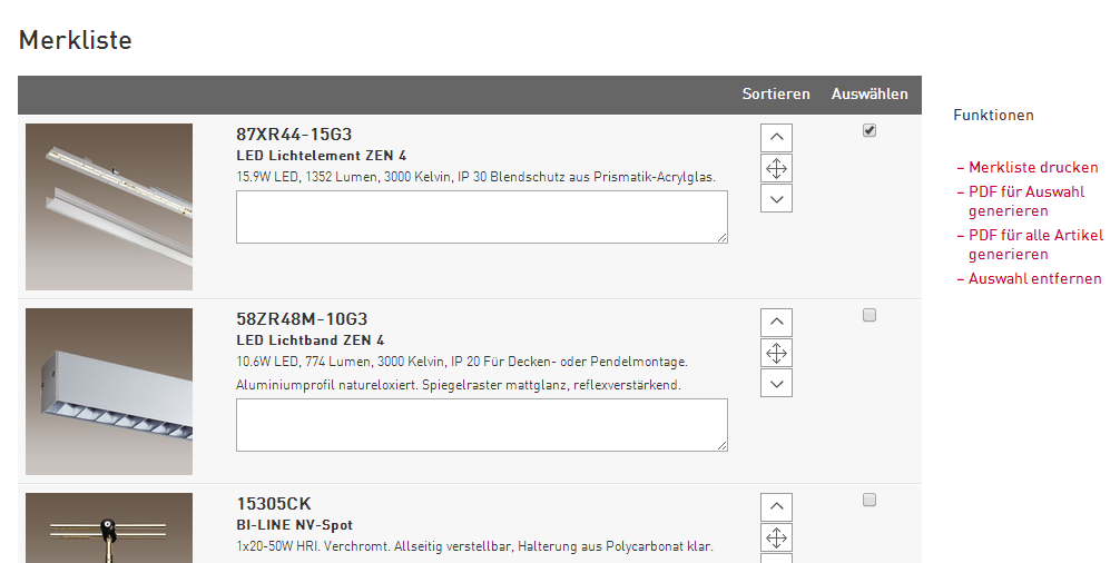 Kunden können sich Modelle und Zubehörteile in einer Merkliste zusammenstellen und die technischen Daten gesammelt in einem PDF aufbereiten lassen.