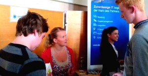 Die Präsentation der snowflake darf als voller Erfolg bezeichnet werden. Unsere Reputation, der branchenübergreifende Kundenstamm, der Open Source Gedanke, die diversen MA-Benefits, die internen Events, die Förderung von Weiterbildung intern und extern sowie das Arbeitsklima und das Social Life rund um die Arbeit haben die Schüler sichtbar und hörbar überzeugt. So war auch das Interesse am Unternehmensstand nach den Präsentationen und der Podiumsdiskussion zum Thema Bewerbungsunterlagen, Vorstellungsgespräche und Arbeitsalltag, gross. Die Goodies, Broschüren und Visitenkarten waren sehr schnell vergriffen und das snowflake-ABC mit weiteren vielen Gründen, warum man sich unbedingt bei der snowflake bewerben soll, wurde auf dem iPad gern vom Einen oder Anderen durchgelesen.