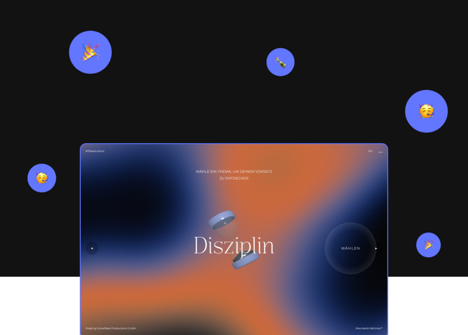 Auf der Microsite können Besucher:innen spielerisch zwischen verschiedenen Themen wie Disziplin, Entschlossenheit oder Erholung mit zugehörigem 3D-Objekt ihren Neujahrsvorsatz für 2023 wählen und schmunzeln. Zusätzlich haben sie die Möglichkeit, ihren eigenen Vorsatz mit uns zu teilen, welcher mit etwas Glück Teil der nächsten #11Resolutions-Kampagne im 2023 / 2024 wird.